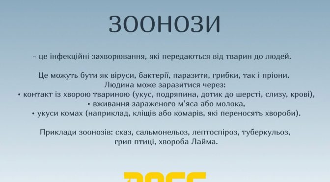 Зоонози — це інфекційні захворювання, що передаються від тварин до людини. Вони можуть бути спричинені вірусами, бактеріями, а також грибками, паразитами і пріонами. Передача інфекції…Читати далі