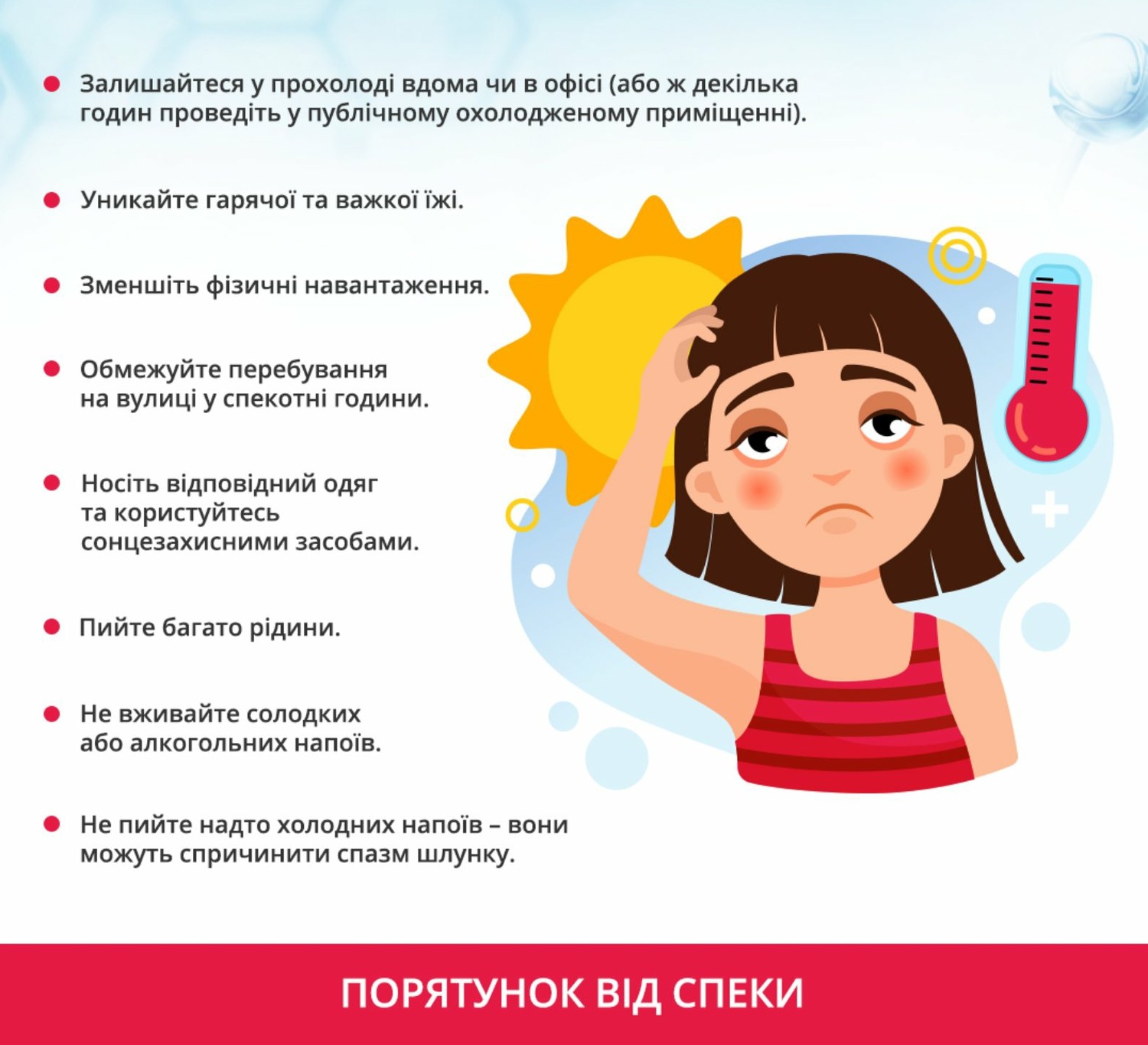 Не перебувайте на вулиці в спекотні години. Особливо в період з 11:00 до 16:00, коли сонце світить найсильніше.